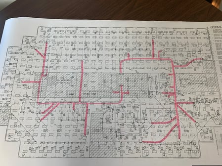 We always appreciate it when customers provide mechanical blueprints of their buildings. They help in a number of ways. One of the greatest benefits is that drawings can be used to target specific areas to be serviced. For example, in a recent HVAC cleaning project at a media center, the customer only needed high-pressure ducts to be cleaned, along with the air handling units and VAV (Variable Air Volume) boxes. As pictured here, the highlighted blueprints identify the locations of the equipment to be cleaned.